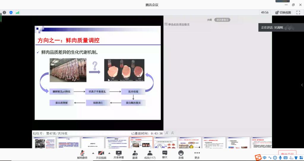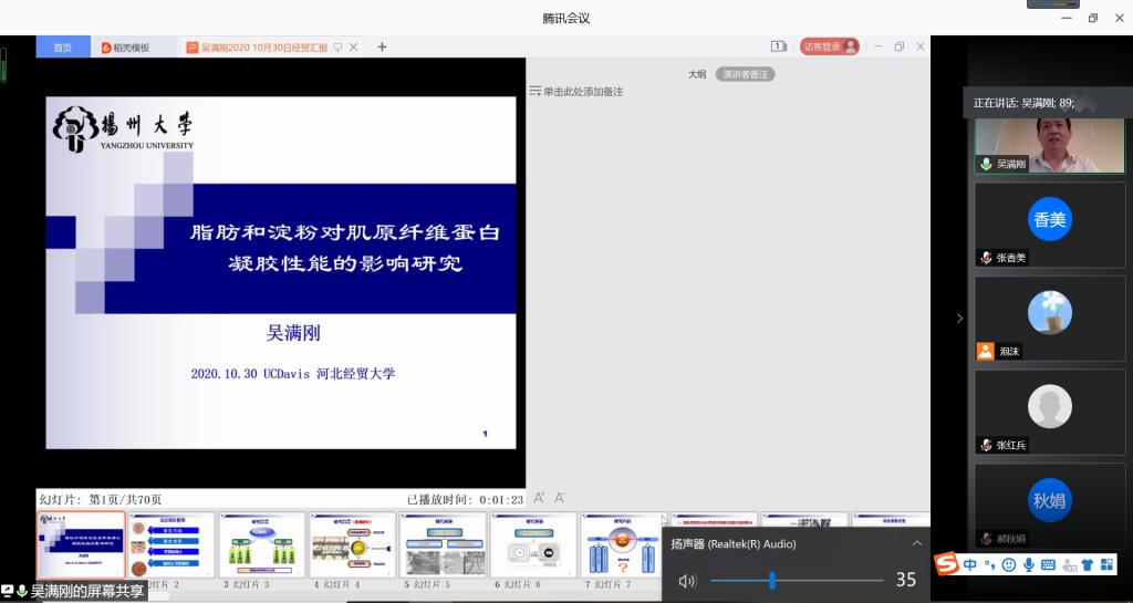 10月30日,正在美国加州大学戴维斯分校访学的扬州大学硕士生导师吴满刚副教授应乐天使邀请,于线上通过腾讯会议平台作了题为“脂肪和淀粉对肌原纤维蛋白凝胶性能的影响研究”的学术报告。报告由乐天使副经理张香美主持,公司百余名师生参加了此次报告会。