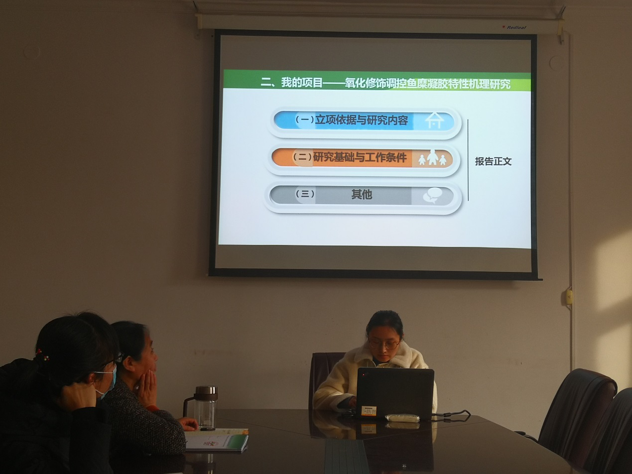 首先,卢涵针对她主持的2018年度国家自科基金项目“氧化调控鱼糜凝胶特性机理研究”的立项依据、研究内容、研究目标、研究方法、研究的技术路线、研究的基础以及可行性分析作了详细讲解,并分享了申报国家自科基金项目的经验和心得。针对研究进程中存在的问题,如怎样进一步利用信息技术手段分析研究实验数据,如何更好地进行学科交叉融合,卢涵表示期盼能与老师们进行合作、交流与探讨。随后,卢涵与参会人员进行了互动交流,并给青年教师在课题的申报提出了三点建议:一是像讲故事一样撰写申报书,注重前后逻辑顺畅、首尾呼应、思路清晰;二是注重本人的研究基础,多积累一些发表的相关的文章;三是多与国际国内本领域专家学者交流,不断汲取新的信息,不断完善改进自己的研究。