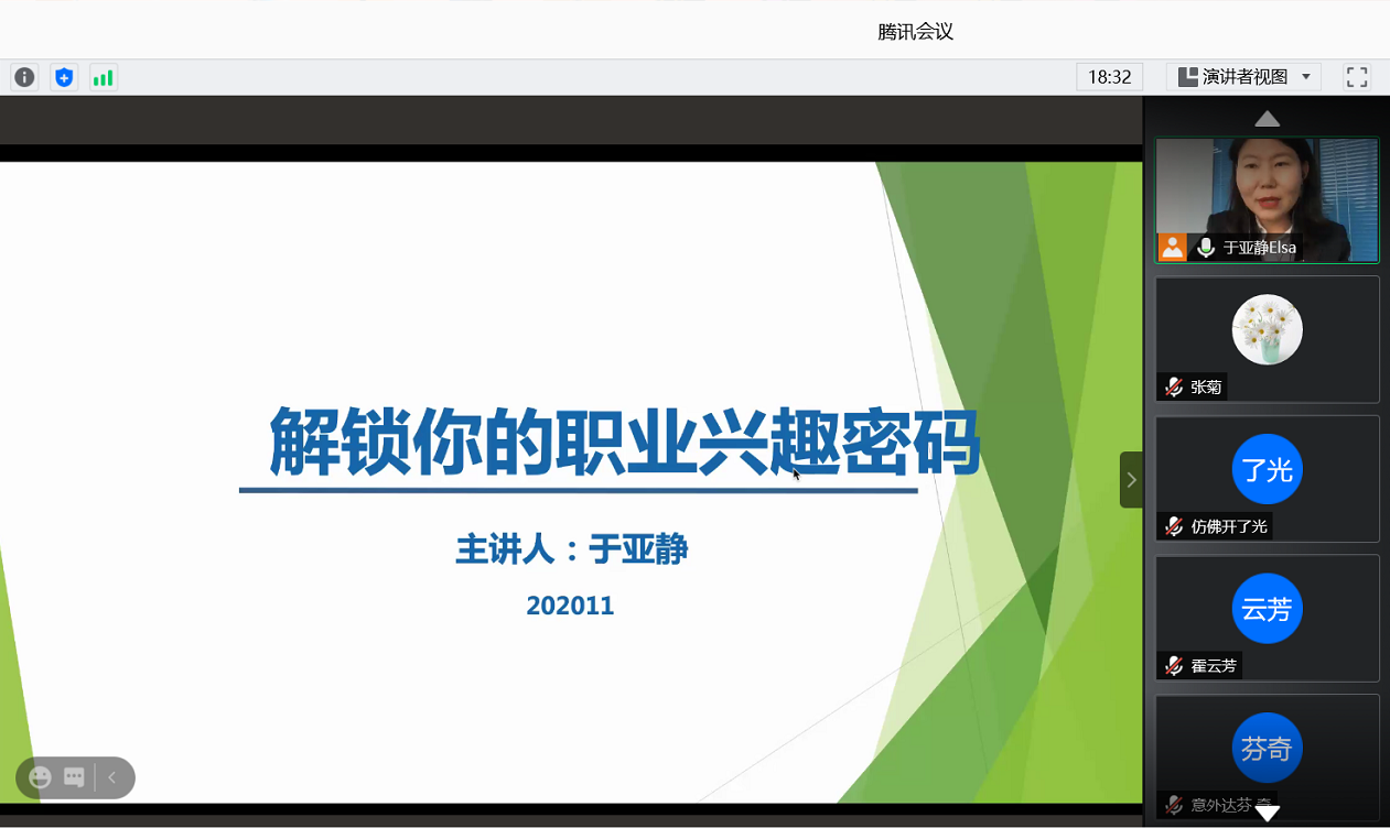11月23日下午,乐天使邀请2000级员工于亚静为乐天使员工作题为《解锁你的职业兴趣密码与老员工生涯规划》的职业规划讲座。本次讲座由张菊老师主持,通过腾讯会议开展,并在微信群里与同学们沟通交流互动。