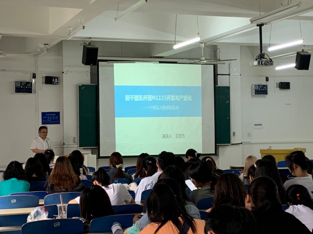 在“健康中国”的大背景下,益生菌以其强大的科技张力和融合力成为了公众对健康产品的新期待。应乐天使邀请,5月31日下午,石家庄君乐宝乳业有限公司正高级工程师、国务院特殊津贴专家王世杰在B401作了题为“副干酪乳杆菌N1115开发与产业化”的专题报告。报告会由公司副经理张香美主持,公司教职工及员工200余人参加。